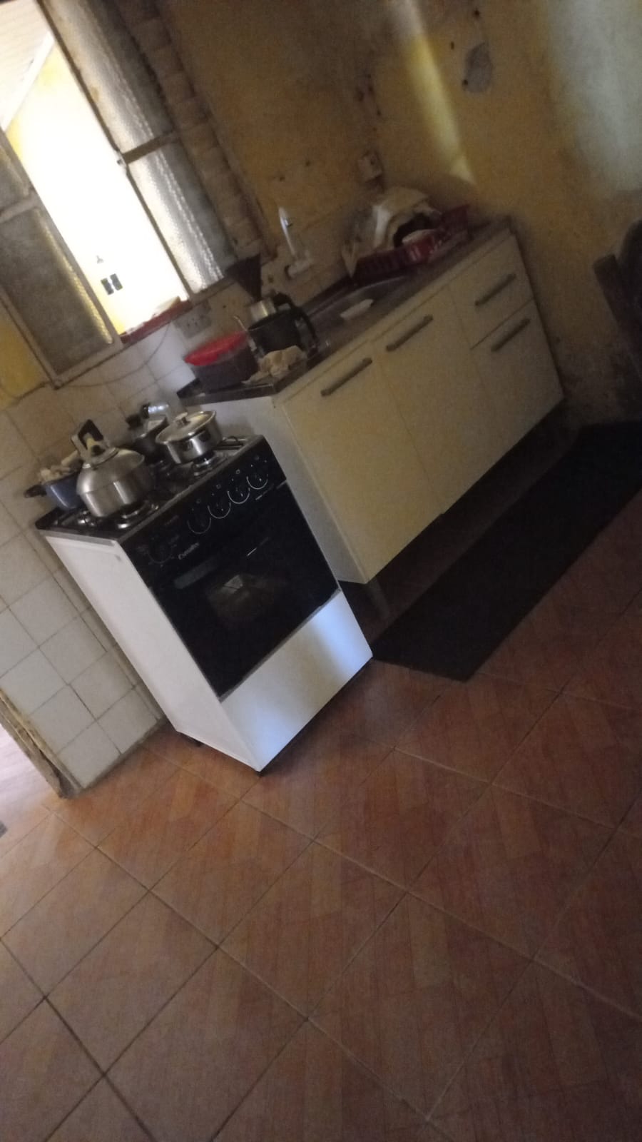 Cama de casal, balcão de pia, mesa com 4 cadeiras, sofá, fogão, refrigerador,